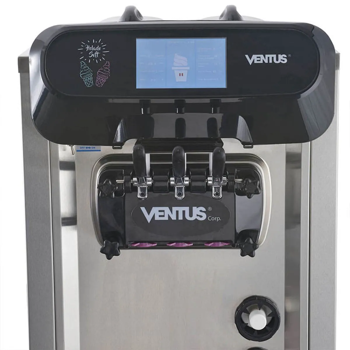 Posee 3 manillas abatibles que permiten servir dos sabores simples y uno mixto, con bajo nivel de ruido y estructura montada sobre 4 ruedas de alta resistencia para un traslado cómodo.